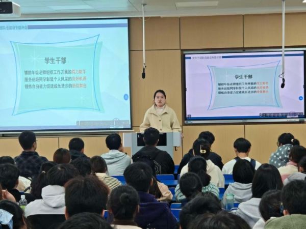 周梦家围绕“职责分工”,指出学生干部应在参谋辅助、组织管理、沟通协调与服务同学等方面发挥重要作用,真正成为师生之间的桥梁与纽带。并介绍了“综合考核机制”,该机制从学业成绩、工作测评、年级评定等多个维度进行量化评价,确保学生干部队伍始终保持先进性与战斗力。
