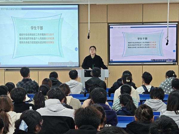 会上,胡伟首先从学生干部的“自身特性”切入,指出学生干部应具备较高的竞争起点、严格的选拔标准、全面的能力素质以及鲜明的标杆意识,鼓励大家在服务同学中实现自我成长。在“角色定位”环节,明确阐述了学生干部兼具“普通学生”与“学生骨干”的双重身份,应在各方面发挥好模范带头作用。他强调,作为组织者、协调者和服务者,学生干部应树立“甘于奉献、勇于担当”的意识,坚持全力以赴的工作态度。在“选拔任用”与“教育培养”部分,胡伟提出“兼职双岗、轮转换岗、受察停岗、免职离岗”等动态管理机制,并通过强化思想引领、注重工作方法、开展专题培训等方式,全面提升学生干部的政治素养与实务能力。