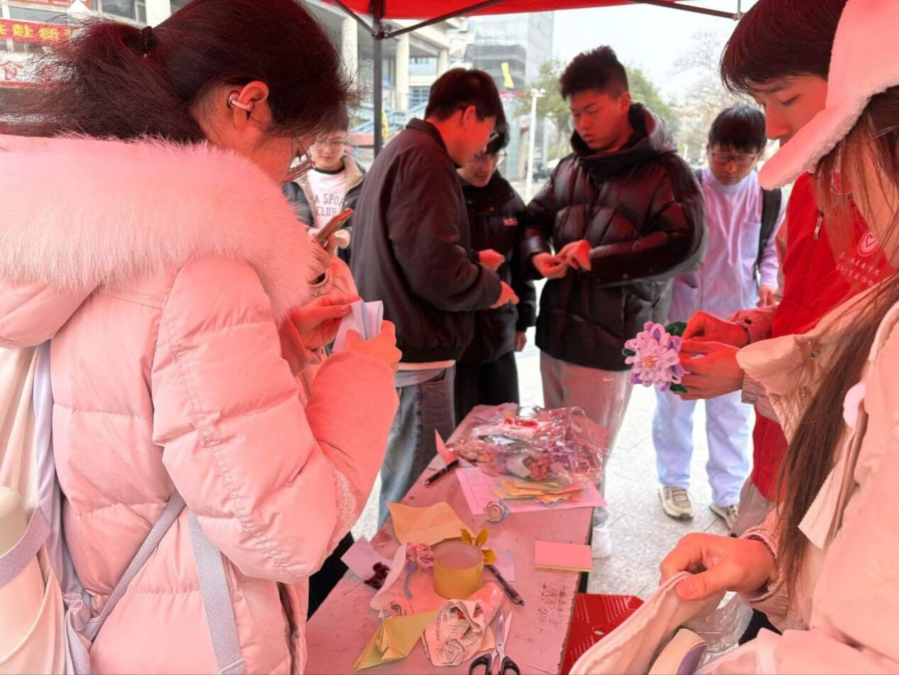 手工制作区同步开展创意手作活动。学生们利用扭扭棒、彩纸等材料制作手工花朵,作品表达对女性群体的美好祝福。活动结束后,优秀作品将在第一临床医学院青协官方媒体平台展示,进一步扩大活动影响。