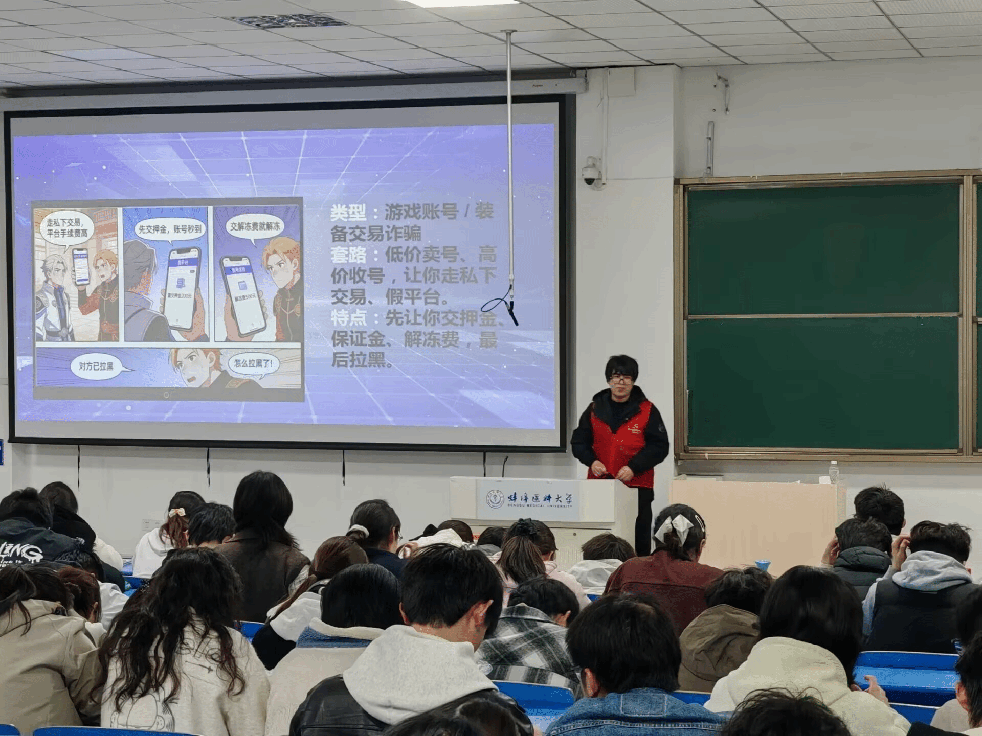 活动伊始,蚌埠薪光志愿服务队副队长围绕当前高发的网络诈骗类型,结合实际案例,深入讲解了反网络诈骗的基本常识与防范技巧,提醒同学们时刻保持警惕,提高辨别诈骗陷阱的能力,切实筑牢校园反诈“防火墙”,守好个人财产安全。