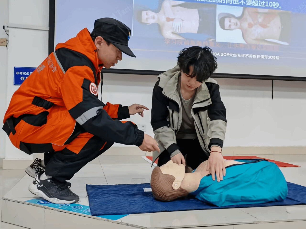 随后,安徽省防灾减灾救灾协会救援队成员为同学们系统讲解了心脏复苏(CPR)及自动体外除颤器(AED)的使用流程。队员们通过现场演示、分步讲解,详细说明了急救操作的关键步骤与注意事项。为强化学习效果,活动设置了体验环节,同学们踊跃参与、积极尝试,救援队员逐一指导,确保动作规范、流程准确。参与体验的同学还获得了精心准备的礼品,现场气氛热烈,培训成效显著。