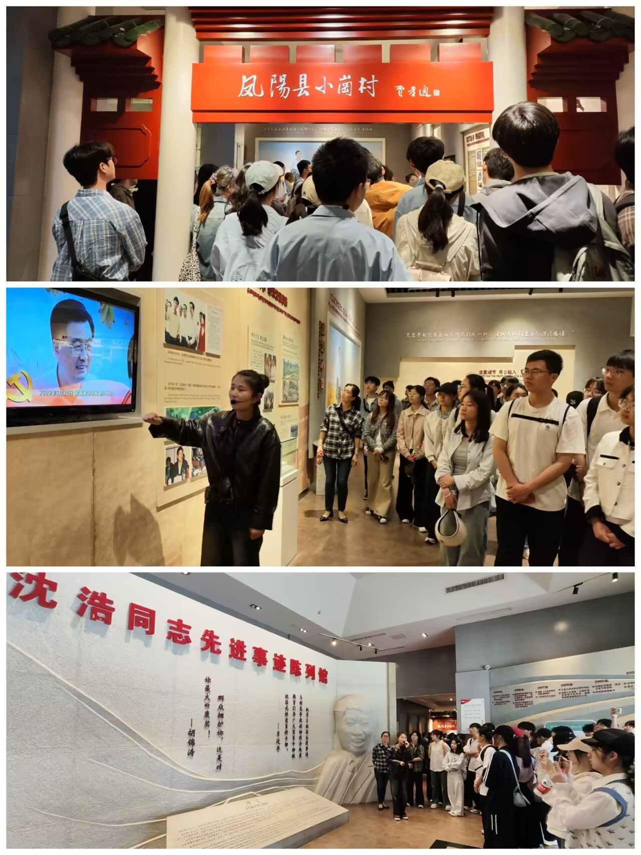 抵达小岗村后,师生党员怀着崇敬之心走进沈浩同志先进事迹陈列馆,开启一场深刻的精神洗礼。馆内照片、日记、遗物等实物,生动还原了沈浩同志扎根小岗六年的奉献历程。他走遍全村每户人家,制定发展蓝图,打通交通瓶颈,招商引资改建村民住房,让小岗村面貌焕然一新,用生命诠释了党员初心,沈浩同志“把群众当家人”的情怀也深深打动了在场每一位党员。大家纷纷表示,要以沈浩同志为榜样,将奉献精神融入学习工作。